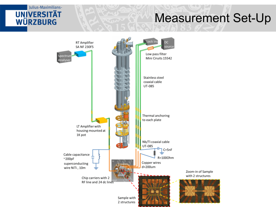 The samples are shown in the zoomed in photo on the bottom right. This entire system is contained within a dilution refrigerator save for the boxes at the ends of the green cables. In order to read the signal output on the spectrum analyzer the signal needs to be amplified by quite a bit. It is not enough to just increase the input signal since, as mentioned, the amount of noise will increase significantly. Using just a single amplifier at room temperature (pictured in blue) is subject to losses along the cable resulting in a low signal-to-noise ratio. Introducing a second amplifier within the fridge that is kept also at low temperatures will help to amplify the signal enough so that the losses along the rest of the cable become negligible.