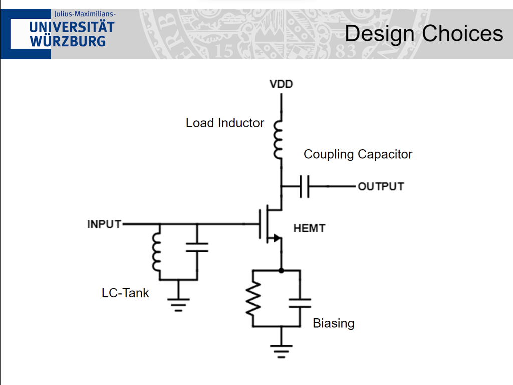 The HEMT is biased using a resistor and capacitor in parallel to set the DC operating point of the HEMT. This is important so that it behaves properly in a way which we expect. And a HEMT is chosen specifically for it’s excellent charge carrier mobility characteristics thus producing less noise.
