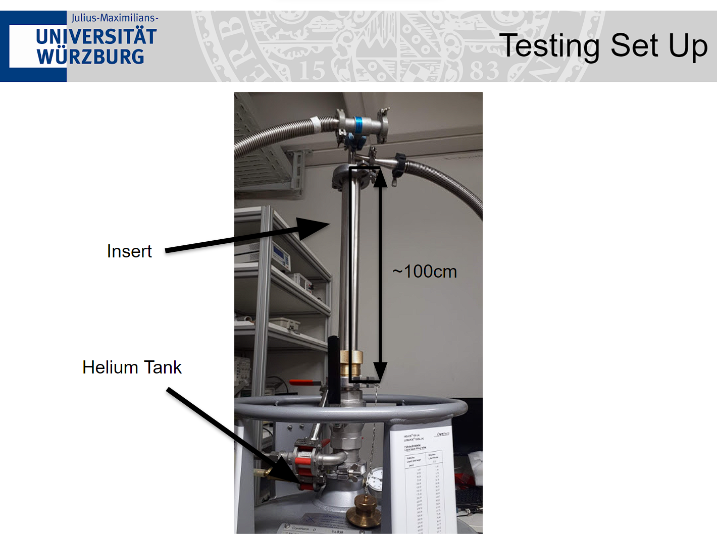 The set up for testing is shown above. The circuit was sealed into a giant metal insert which would have the air pumped out. The entire metal tube would then be lowered very slowly into a tank of liquid Helium. The lack of air in the tube will make it so that there will be no condensation which could cause issues in the circuit. The tube is lowered slowly so that there isn’t a thermal shock which would both build up pressure in the Helium tank as the liquid evaporates, and to evenly cool the insert so it will not wear down. The whole process takes about an hour of careful work (sometimes just to realize that the cables stopped working because something shifted when you seal the tube).
