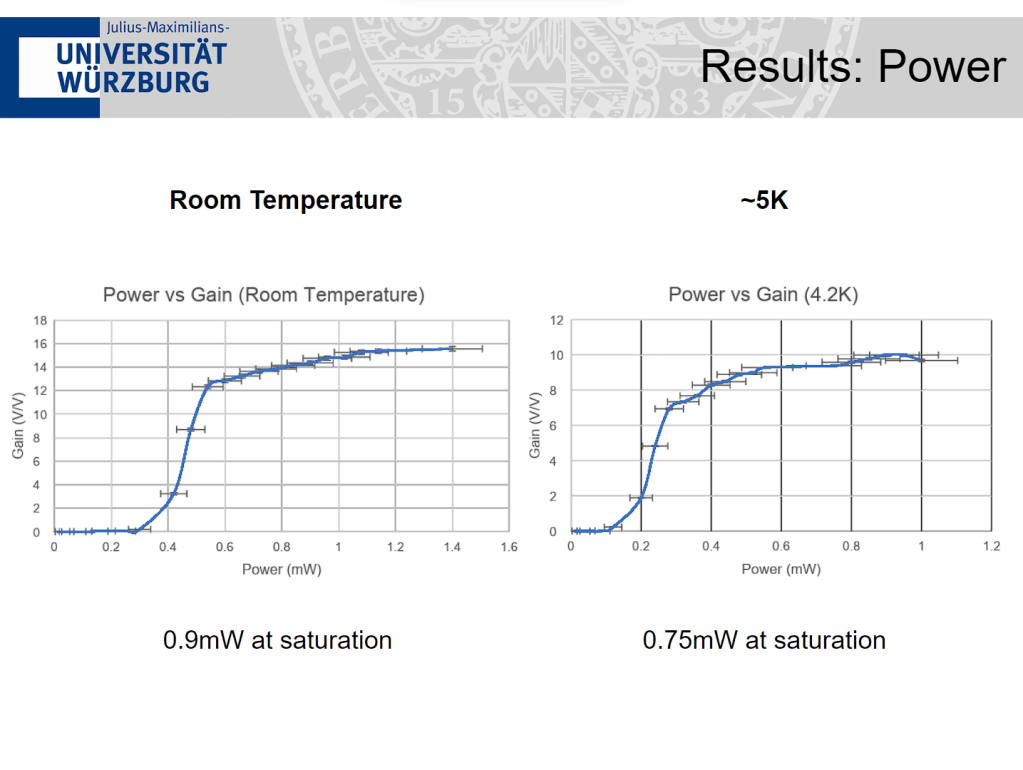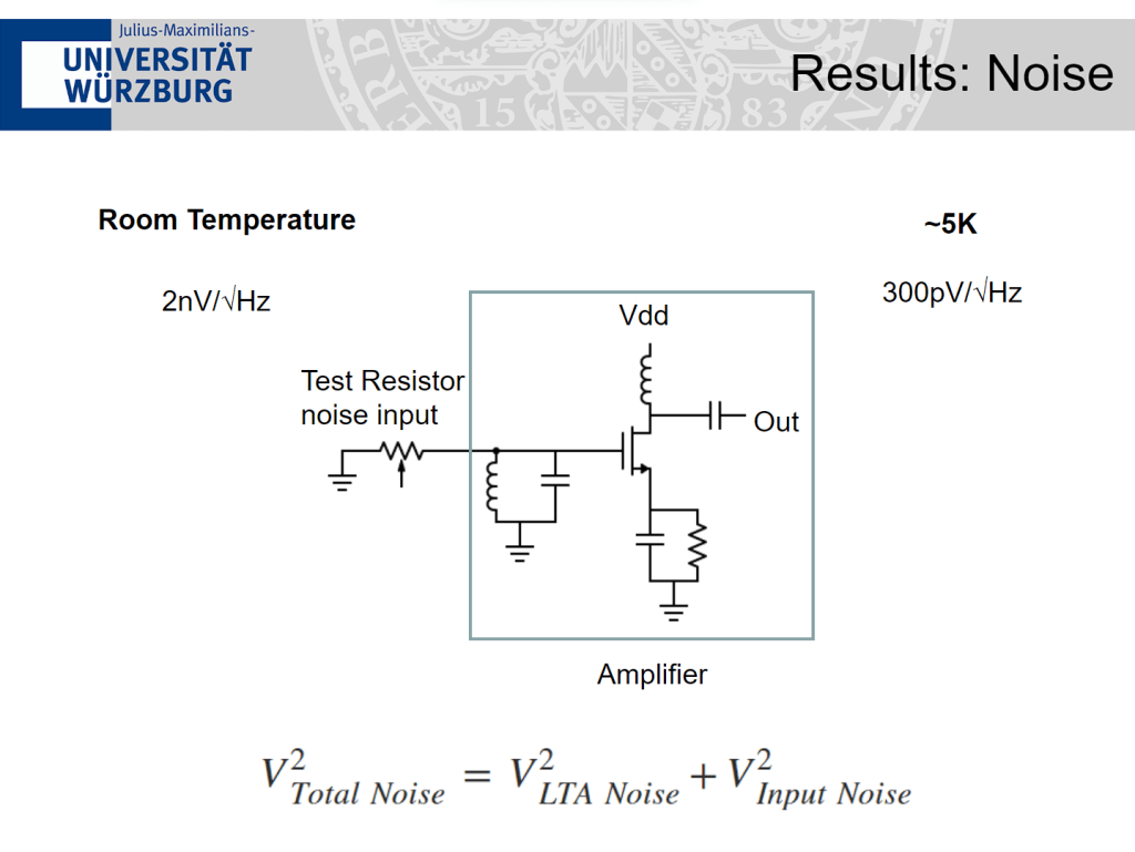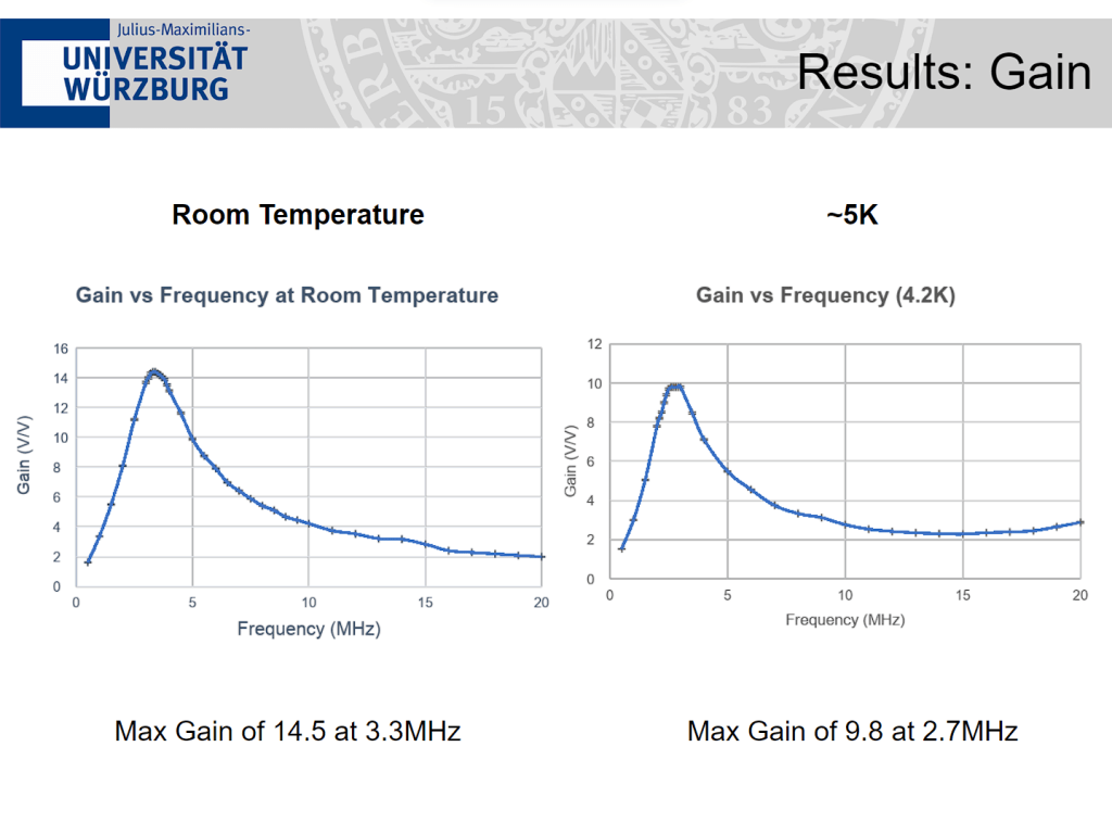 In summary, when going from room temperature to ~5K, the gain is reduced by about 33% but still workable, power consumption is reduced by 17%, and input referred noise is reduced by 85%.