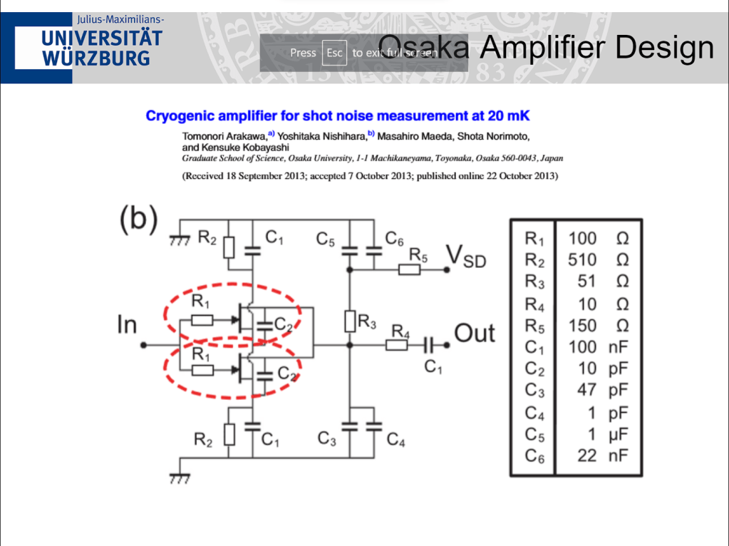 There are two amplifier designs which we were benchmarking against to evaluate the performance of our device. The first comes from a paper published from Osaka University by Arakawa et al. The main feature of this design is the use of two High-Electron Mobility Transistors (HEMTs) in parallel. Here they are able to show that this reduces the 1/f noise that is inherent from the HEMTs. The design also uses a lot of passive components for filtering and adjusting the frequency response. The one drawback is that the increased number of components increases the overall thermal noise.