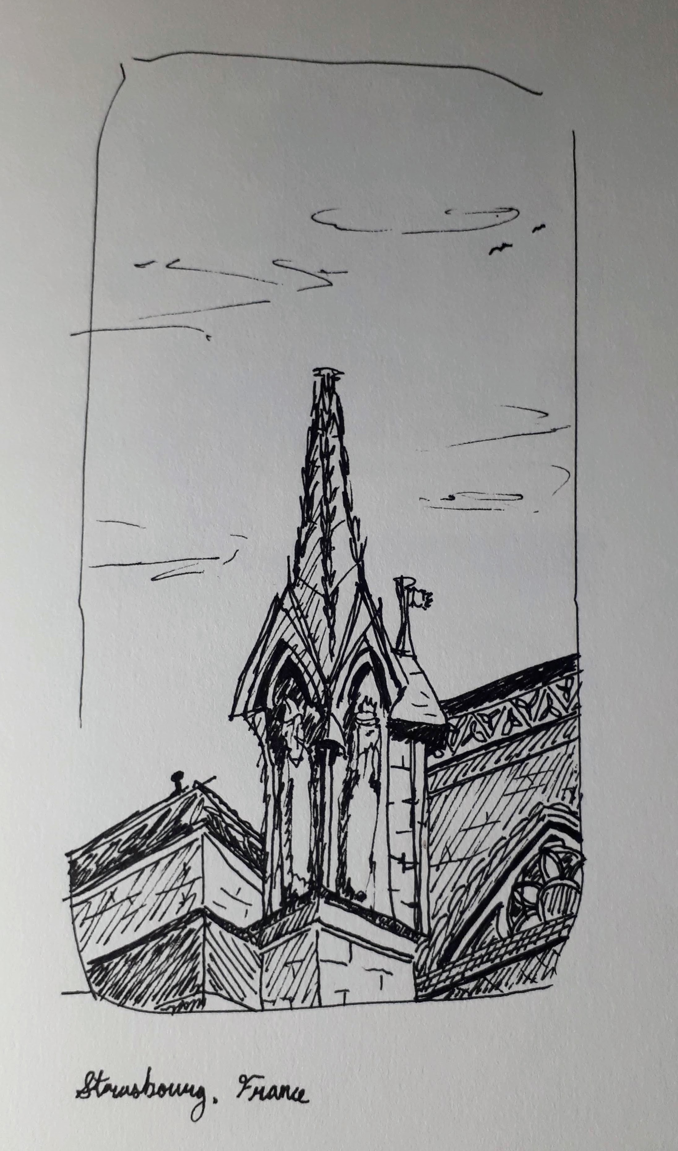 This one doesn’t have a reference photo as I drew it at the scene. Strasbourg is right on the border of Germany and France. It is known for the Cathédrale Notre-Dame and its astronomical clock. It really is a breathtaking piece of architecture. I drew one of the spires with statues in it. The intricate patterns were fun to incorporate.
