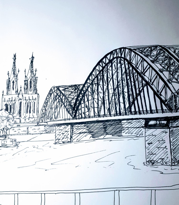 This was my final “big trip” and my favorite piece of work. The incredibly wide bridge in Cologne looked great from this angle. It also looked really cool from the top of that cathedral in the background (which was a fun climb, definitely recommend). At this point I felt like my sketching skills have improved quite a bit. The hardest part is always the start. Going from a blank page to any piece of work takes a vision and a single bold stroke.