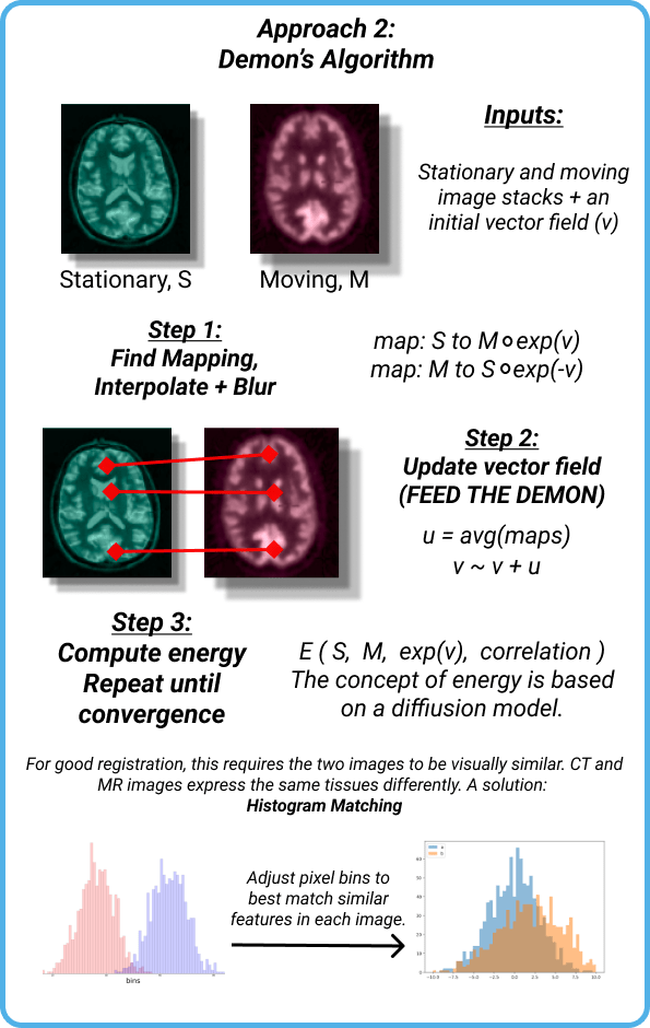 One of the major issues with using Demon’s algorithm, however, is that we will not be able to achieve that CT-MRI registration that we wanted. The pixel intensities of similar features in each image simply do not correlate so dropping an MRI sheet onto a CT solid produces some nonsensical results. This is why a step is needed before using Demon’s in which the pixels are normalized to each other. We investigated histogram matching for this step, but the results were pretty inconclusive. Better methods exist and definitely need to be implemented before implementing Demon’s algorithm but it is still useful to look at how the algorithm performs.
